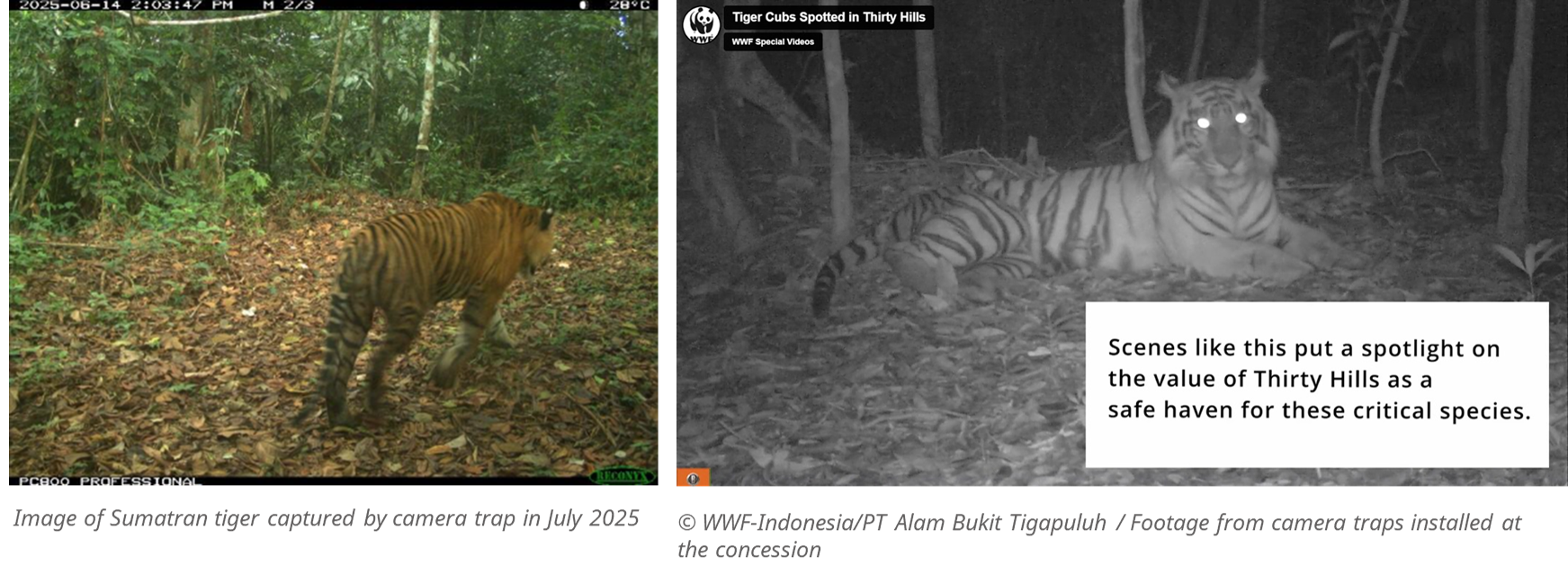 Sumatra has hundreds of wildlife species (thousands if you include insects), including 200 mammals and nearly 600 bird species. Between 2023 and 2025, a total of 48 camera traps were deployed to monitor wildlife activities within the concession. This has provided a glimpse of the rich biodiversity within the concession area, capturing remarkable scenes such as a Sumatran tiger and her two cubs, orangutans and elephants.