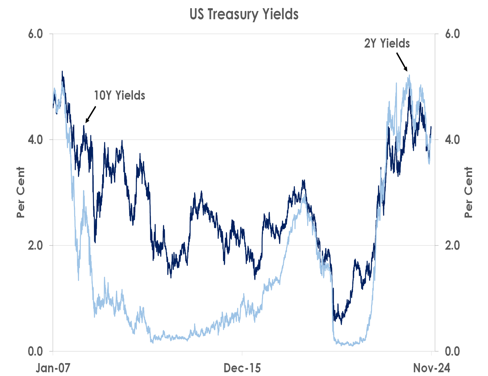 But the election remains too close to call. If Trump wins and the Republicans gain control of both houses of Congress, then yields may surge further towards 5.00% on inflation risks. In contrast, a Harris victory would likely be more favourable for bonds.