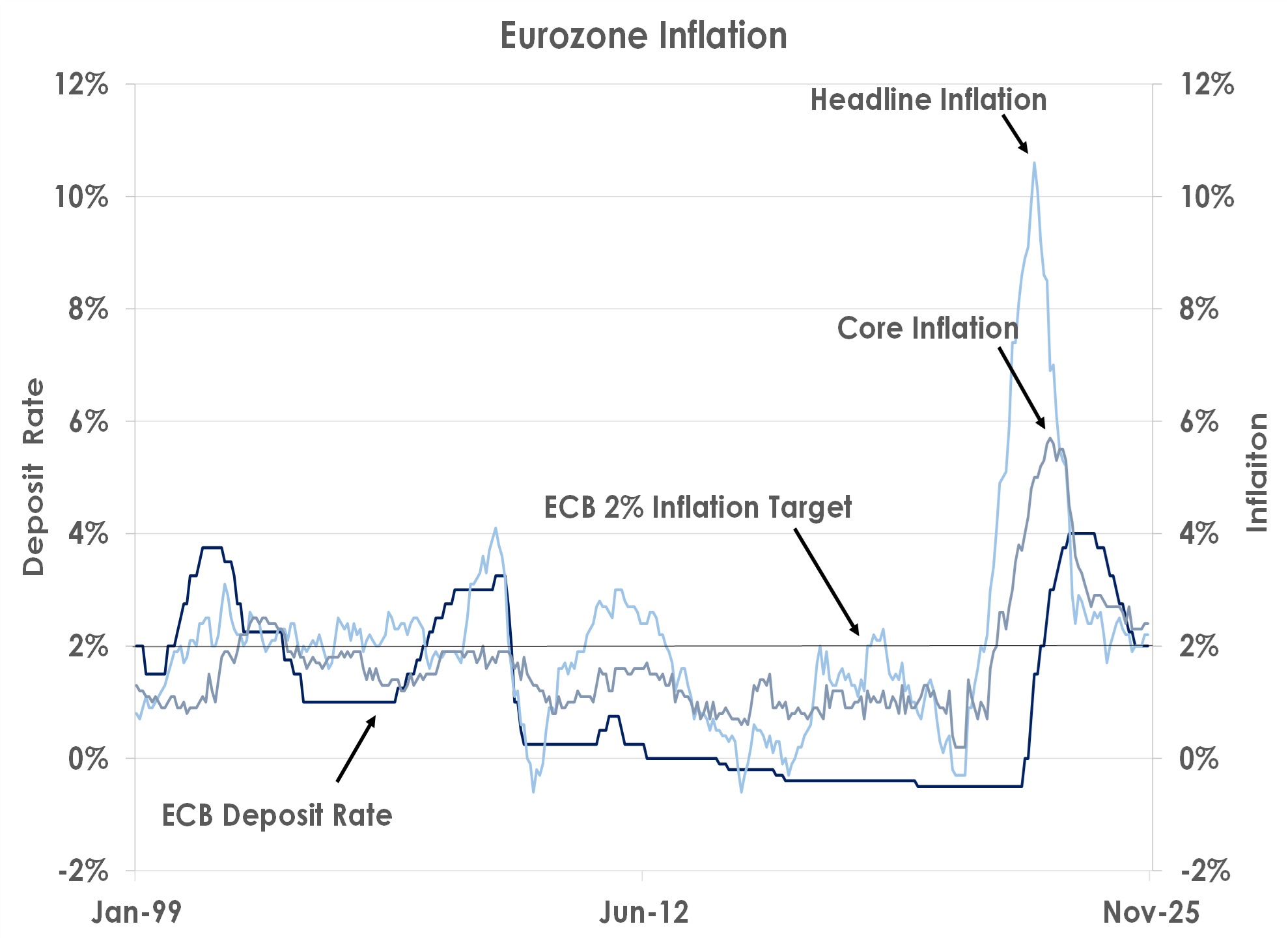 First, the ECB’s Governing Council said it had kept its deposit rate at 2.00% again as inflation was near its 2% target and Eurozone growth had been surprisingly resilient despite trade disputes and geopolitical tensions: