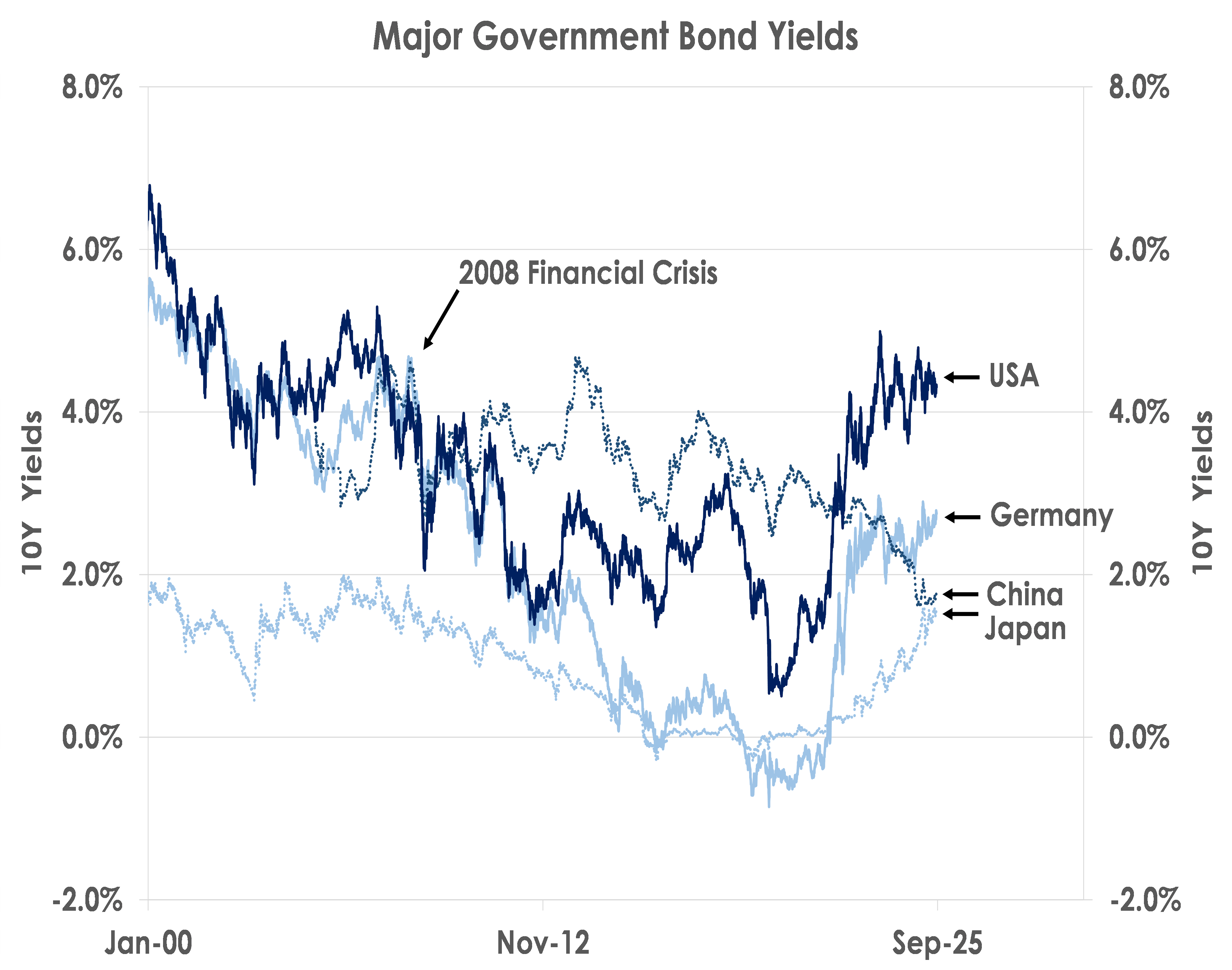 Since the global economy reopened in 2021, spurring inflation while fiscal deficits stayed high, government bond yields have increased in the US, Europe and Japan. In contrast, Chinese bond yields decoupled as Beijing extended strict lockdowns until the end of 2022, China’s consumers turned cautious, domestic property markets weakend and the economy flirted with deflation. Thus, 10Y government bond yields in China fell from 3.25% at the start of 2021 - far above US, German and Japanese yields - to as low as 1.60% after the Trump administration announced huge tariff increases in April.