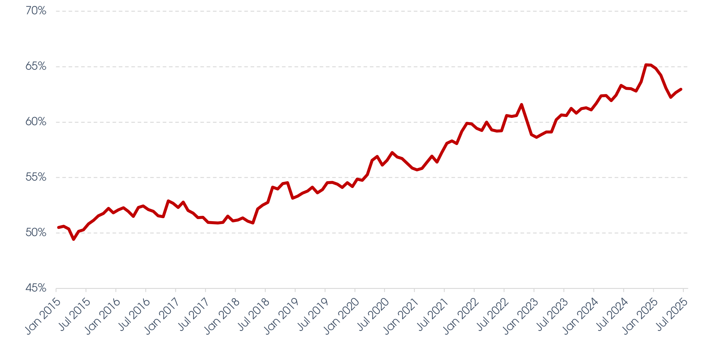 This companion piece examines the most dominant of those exposures: US equities. With a weight touching an all-time high of 65% in global indices earlier in the year (see Exhibit 1), US equities anchor most discretionary portfolios. That weight reflects not only past outperformance, but a set of forward assumptions – around resilience, innovation, capital flows and policy credibility – that may be harder to justify in today’s global regime.