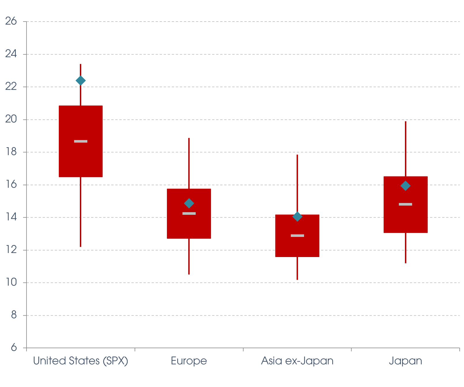 Note: Chart shows the forward P/E ratios of major equity indices based on current prices and blended forward 12-month consensus earnings estimates, vs their respective 10-year historical highs and lows, as well as levels corresponding to one standard deviation above and below their 10-year historical averages.