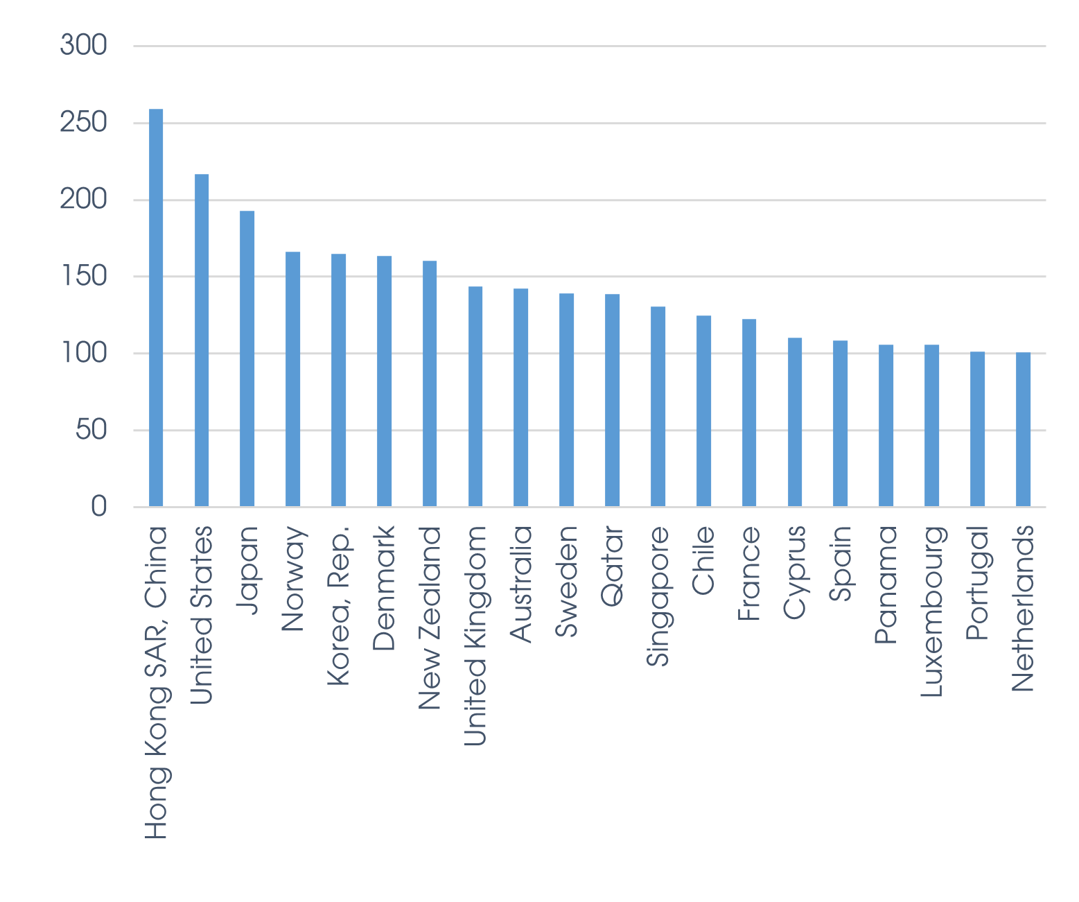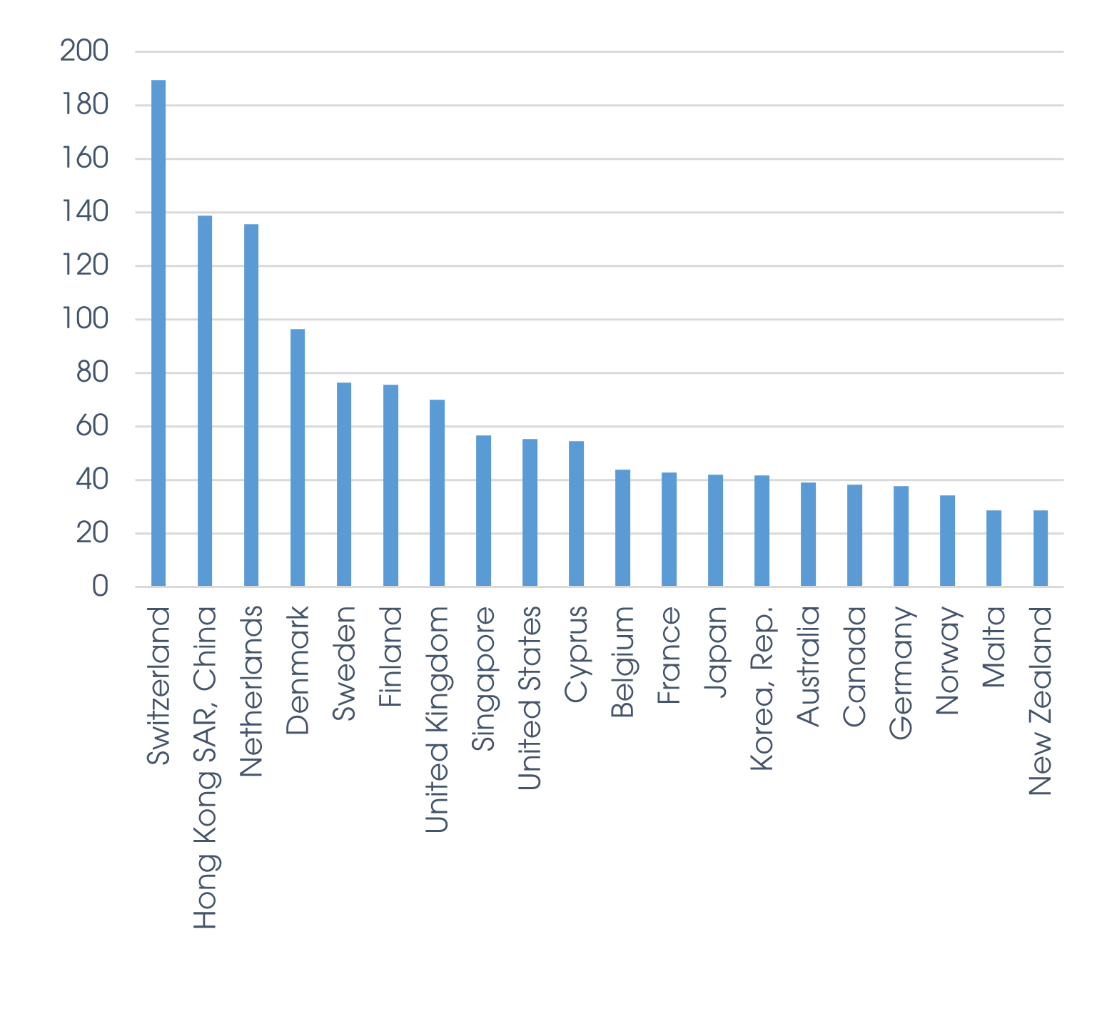 Exhibit 5: Domestic credit to private sector GDP (2020, in %; top 20 high income countries)