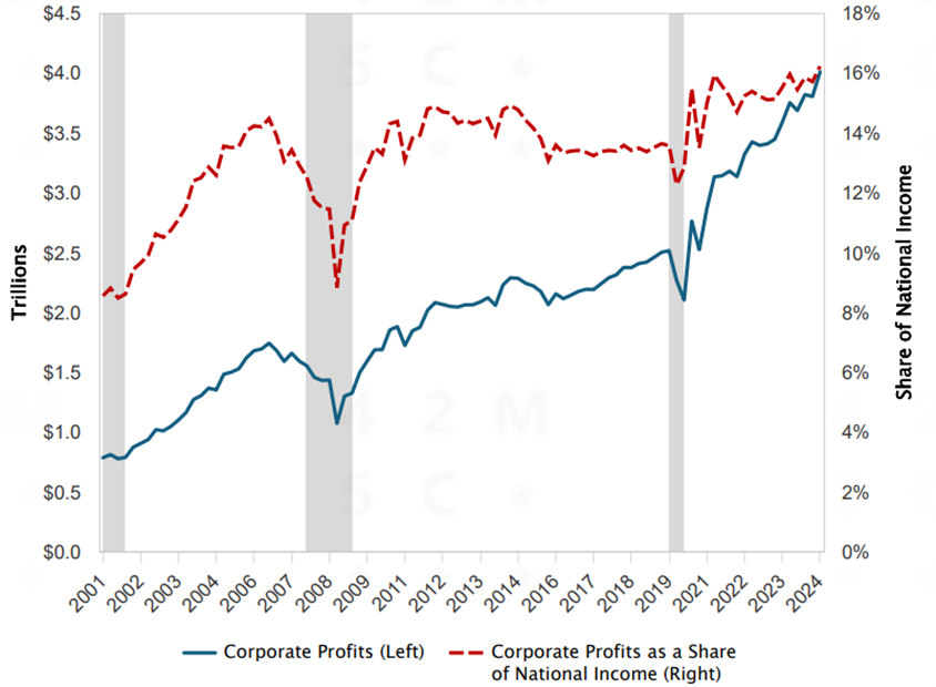 Recent analysis by the Federal Reserve Bank of St. Louis suggests that the post-pandemic surge in US corporate profits has been concentrated in a handful of domestic, non-financial industries – notably retail and wholesale trade, construction, manufacturing, and healthcare – rather than broad-based across sectors or driven by international exposure. This suggests that recent margin strength may not represent a structural reset, and may prove sensitive to cyclical or policy changes.