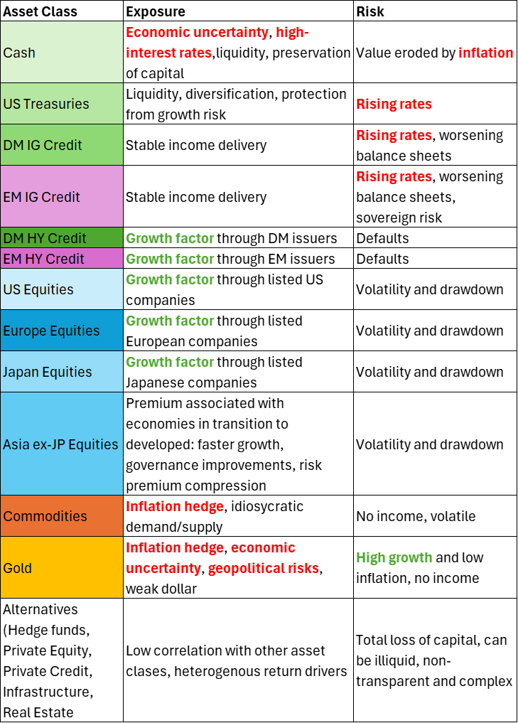 Commodities, such as copper and oil, are often driven by supply-demand dynamics and can act as a hedge against inflation, especially during high growth periods. Gold can be an even more consistent hedge against inflation, as well as against USD depreciation and acute geopolitical risk. Alternatives – which cover a broad range including hedge funds, private markets, infrastructure and real estate – are influenced by growth factors, but also by manager selection, deal and vintage risks, reflecting the heterogeneity of projects and investments in each Alternatives vertical.