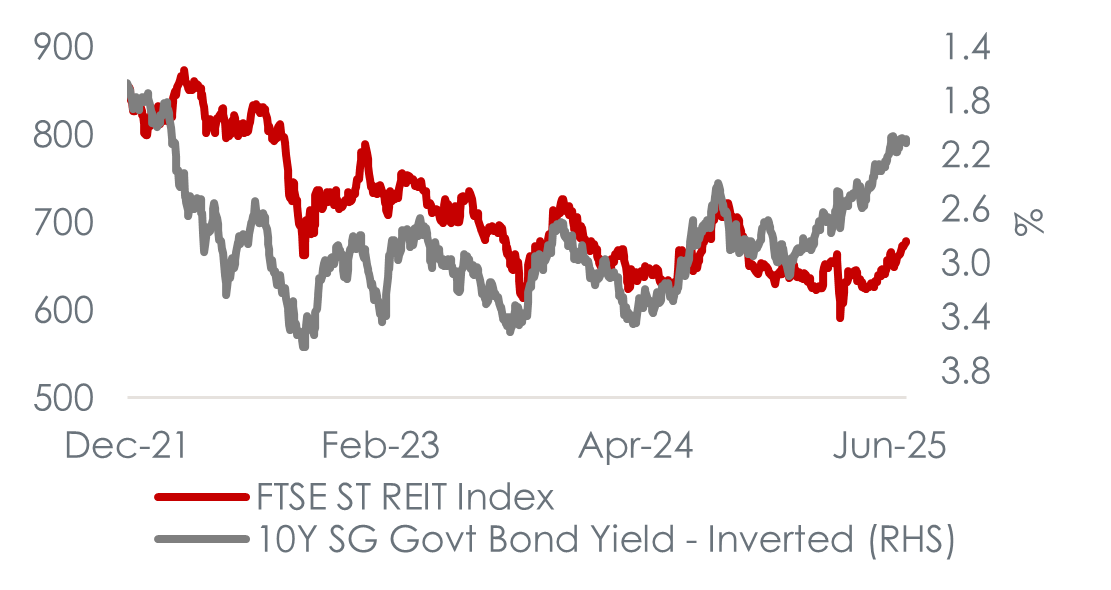 Exhibit 2: Historical trend between FSTREI and Singapore 10Y government yield (inverted)
