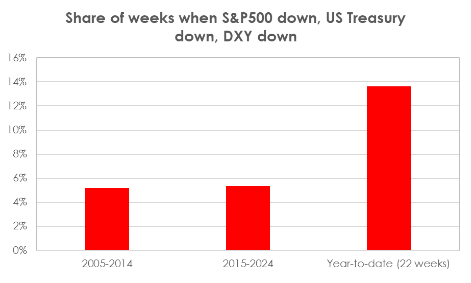 Not only has the USD’s positive relationship with US interest rates become less reliable, its more typical inverse correlation with US equities – especially in sharper sell-offs – has also become challenged. The USD’s diminished safe haven appeal, underscored by triple market warnings of US Treasuries and the USD selling off alongside lower equities happening more often in 2025, is evidence of this regime shift.