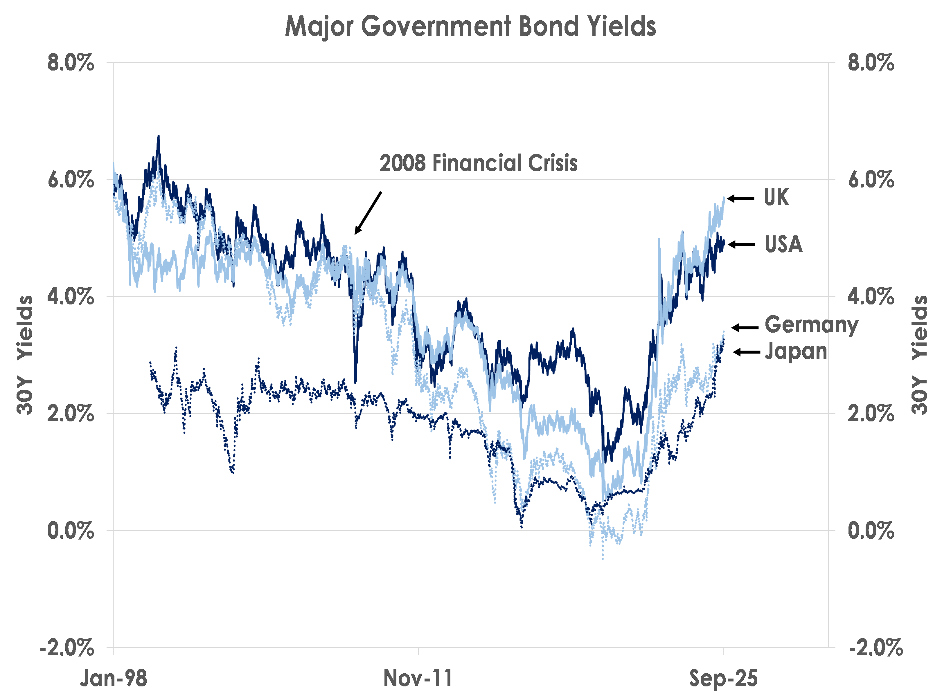 We expect large fiscal deficits, sticky inflation and significant political risks will keep long-term government bond yields volatile in the major economies. Investors should thus be cautious about duration given the risks long-term 10Y and 30Y bonds keep selling off this year.