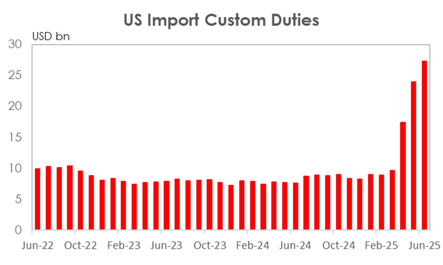 Tariff news no longer dominates headlines but the USD’s tariff woes are far from over. Since the 2 April “Liberation Day”, several tariff changes have been made that should help reduce the risk of pushing the US economy into recession. But according to Yale’s Budget Lab, US consumers now face an overall average effective tariff rate of 15.8%, the highest level since 1936 and a significant increase from the 2-3% at the start of the year. Treasury data also shows a sharp pickup in tariff revenue. The higher tariffs, which are akin to a sales tax hike on imported goods, are likely to slow the US economy in 2H25 and drive inflation higher.