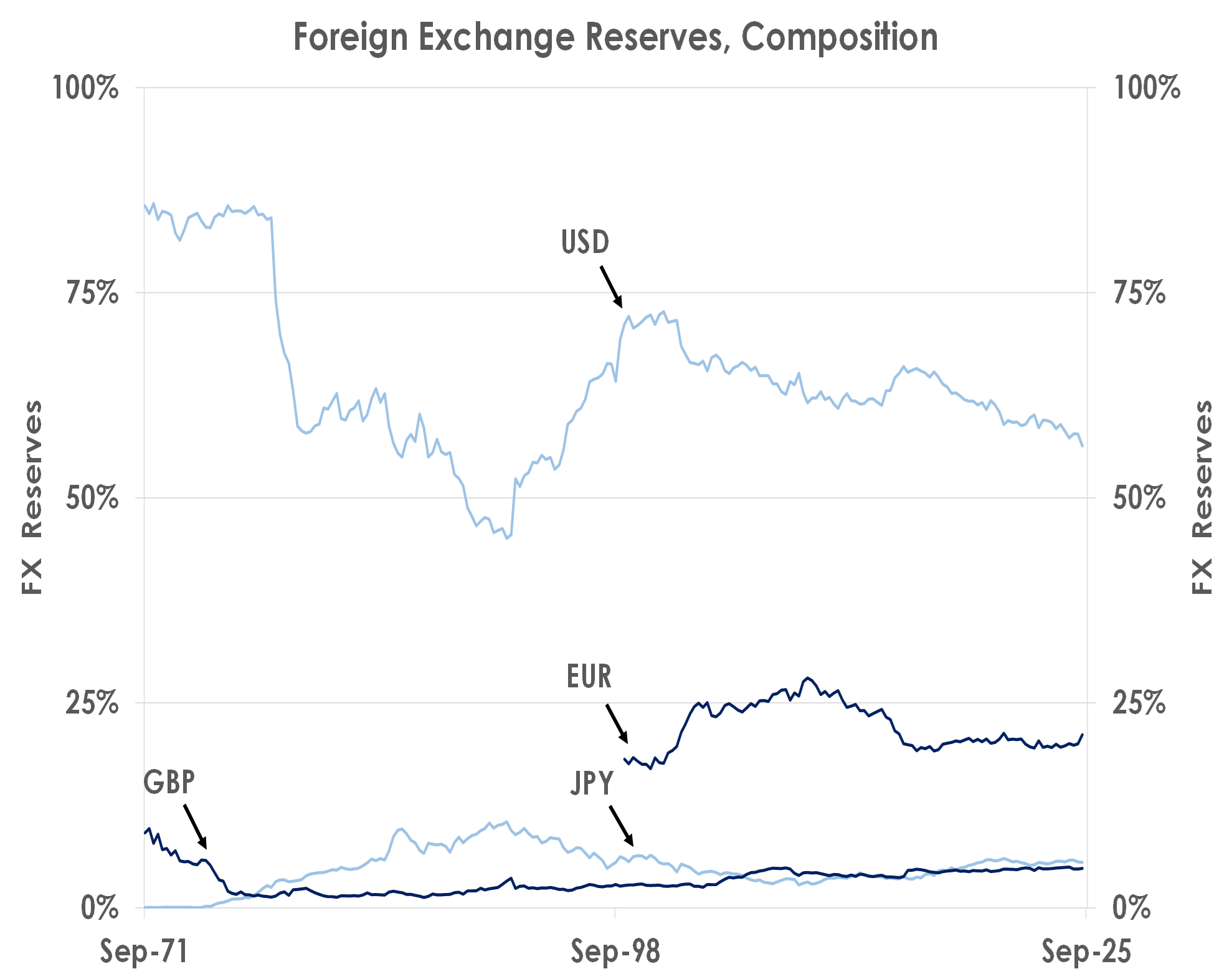 The IMF’s 2Q25 currency composition of foreign exchange reserves (COFER) data shows the share of the USD held by central banks fell to a thirty year low of 56.3%. The first chart shows the greenback’s share in total FX reserves has been declining from almost 73% since 2001 as reserve managers have diversified into other currencies.