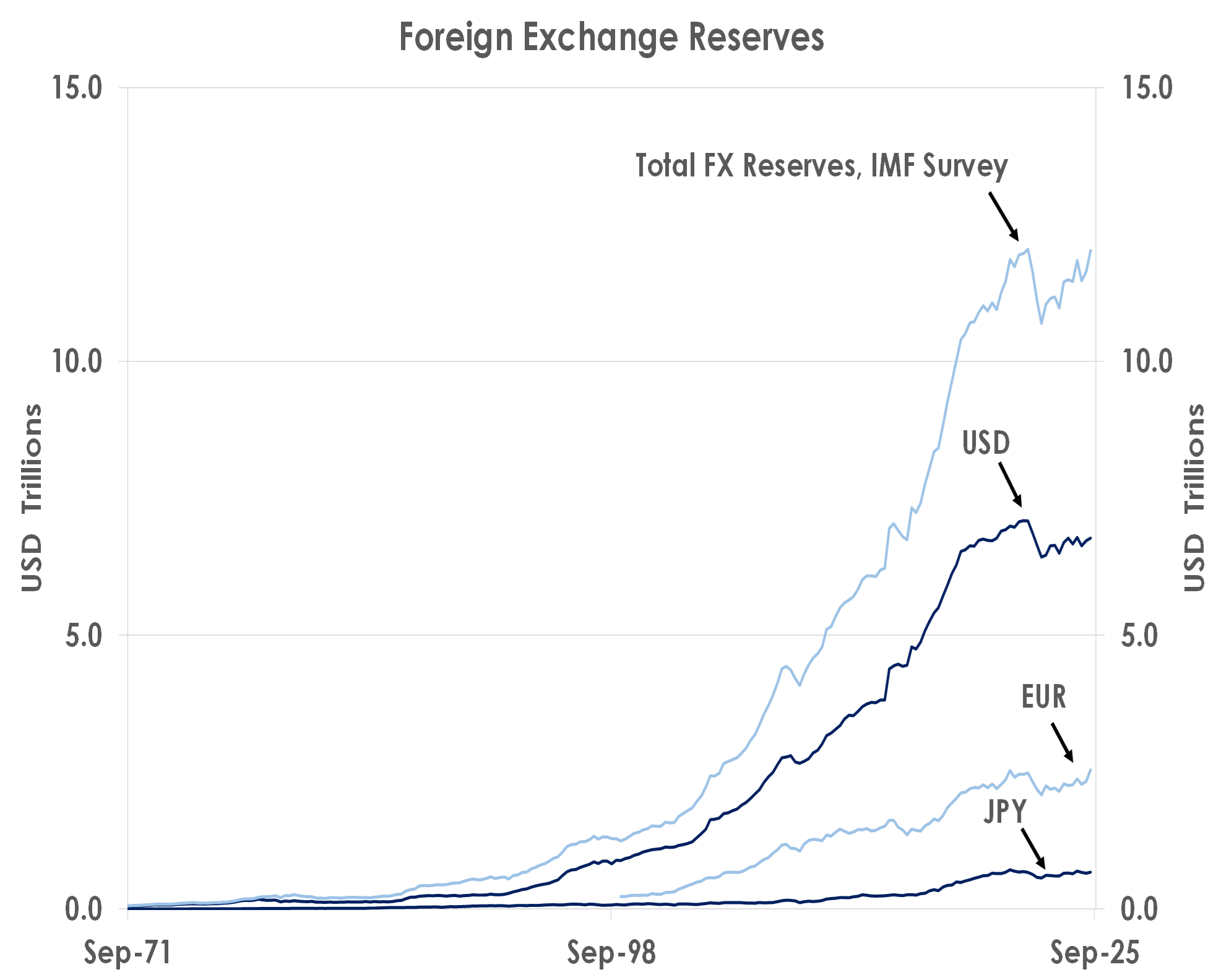 In Q2’25, the stock of USDs was actually steady at USD6.77 trillion of the USD12 trillion of global reserves surveyed by the IMF (see second chart). But the greenback’s share fell as the USD weakened sharply, losing more than 10% of its value against the EUR in the first half of 2025.