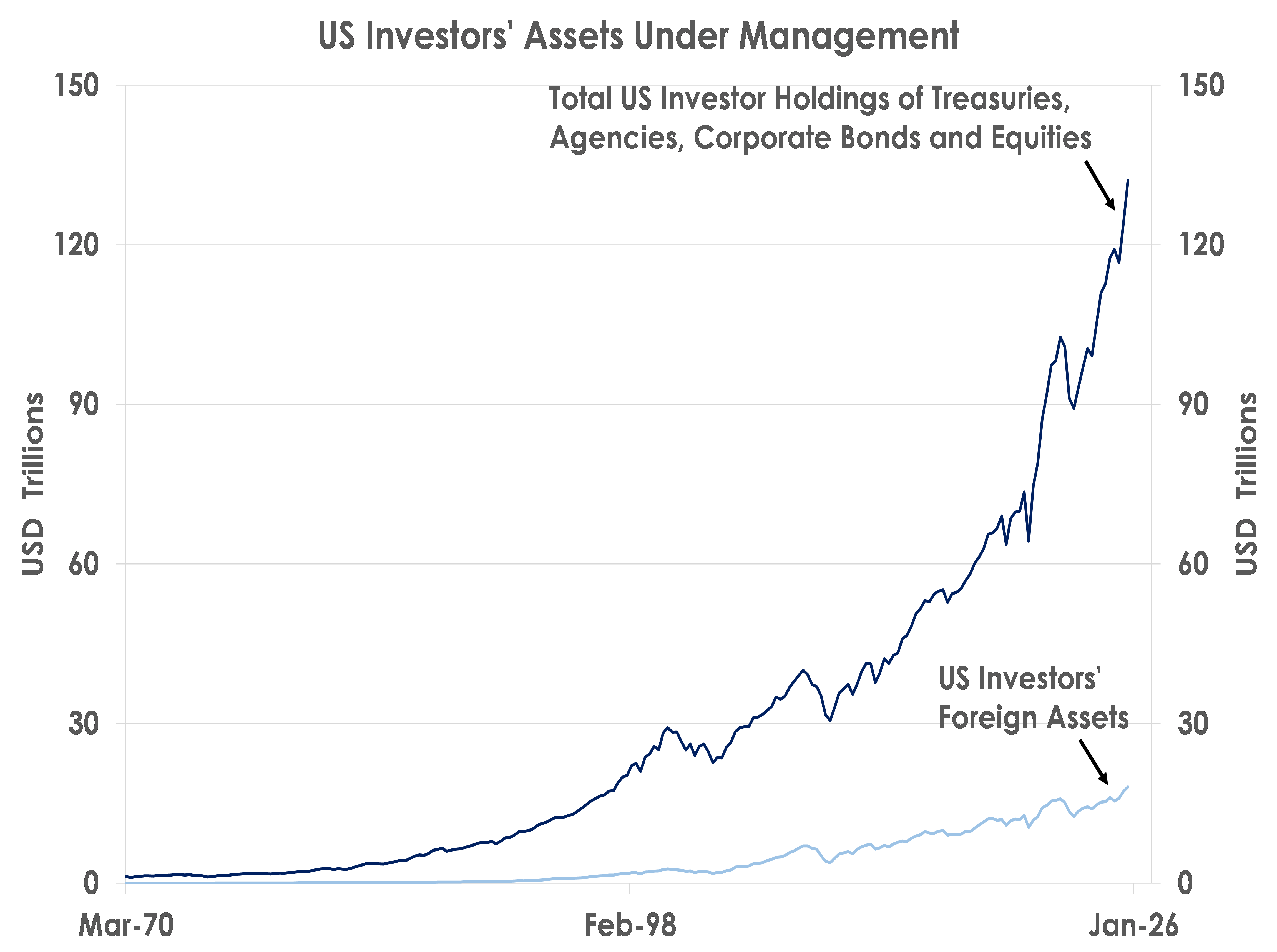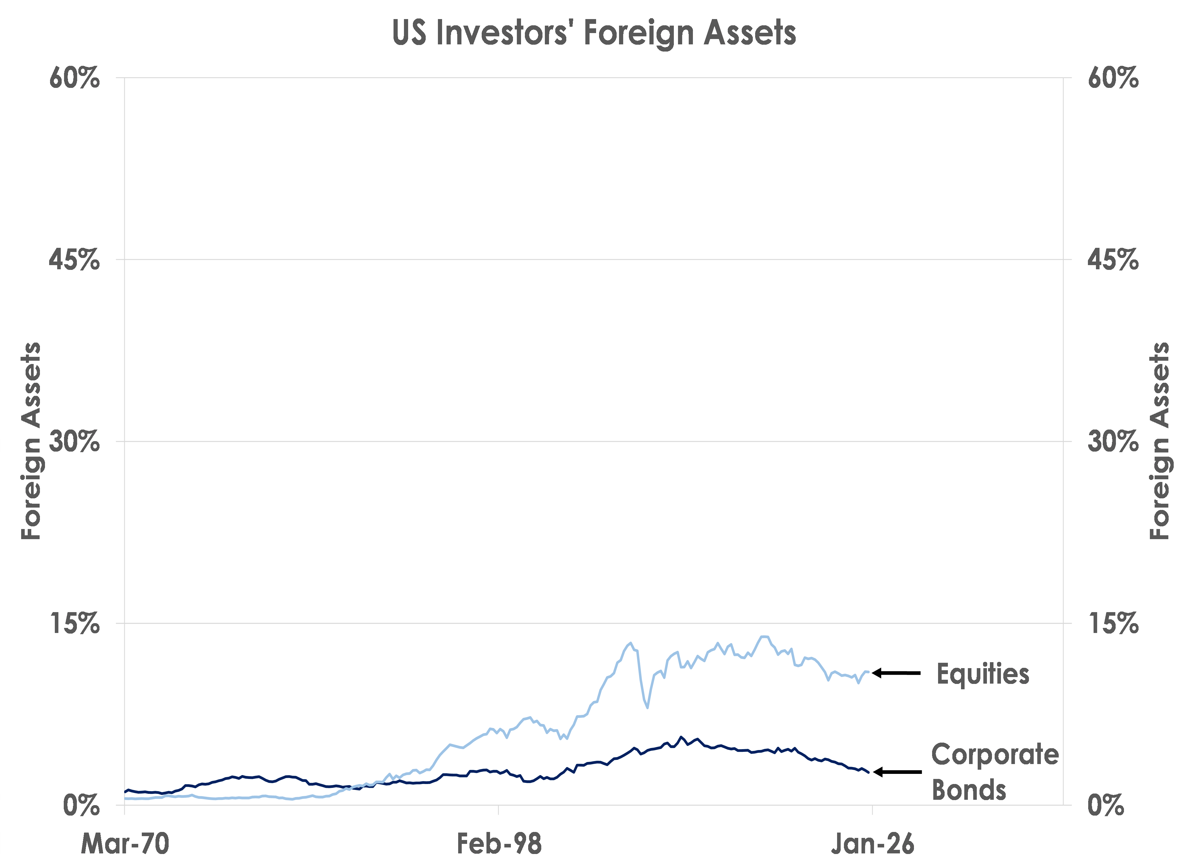If US investors join global investors in diversifying then the USD risks a more disorderly decline. The charts show US fund managers have over USD130 trillion of assets but only 11% of equity holdings in foreign markets. We think investors should thus hedge for the risks of further USD weakness by diversifying portfolios and holding safe havens gold, CHF and SGD.