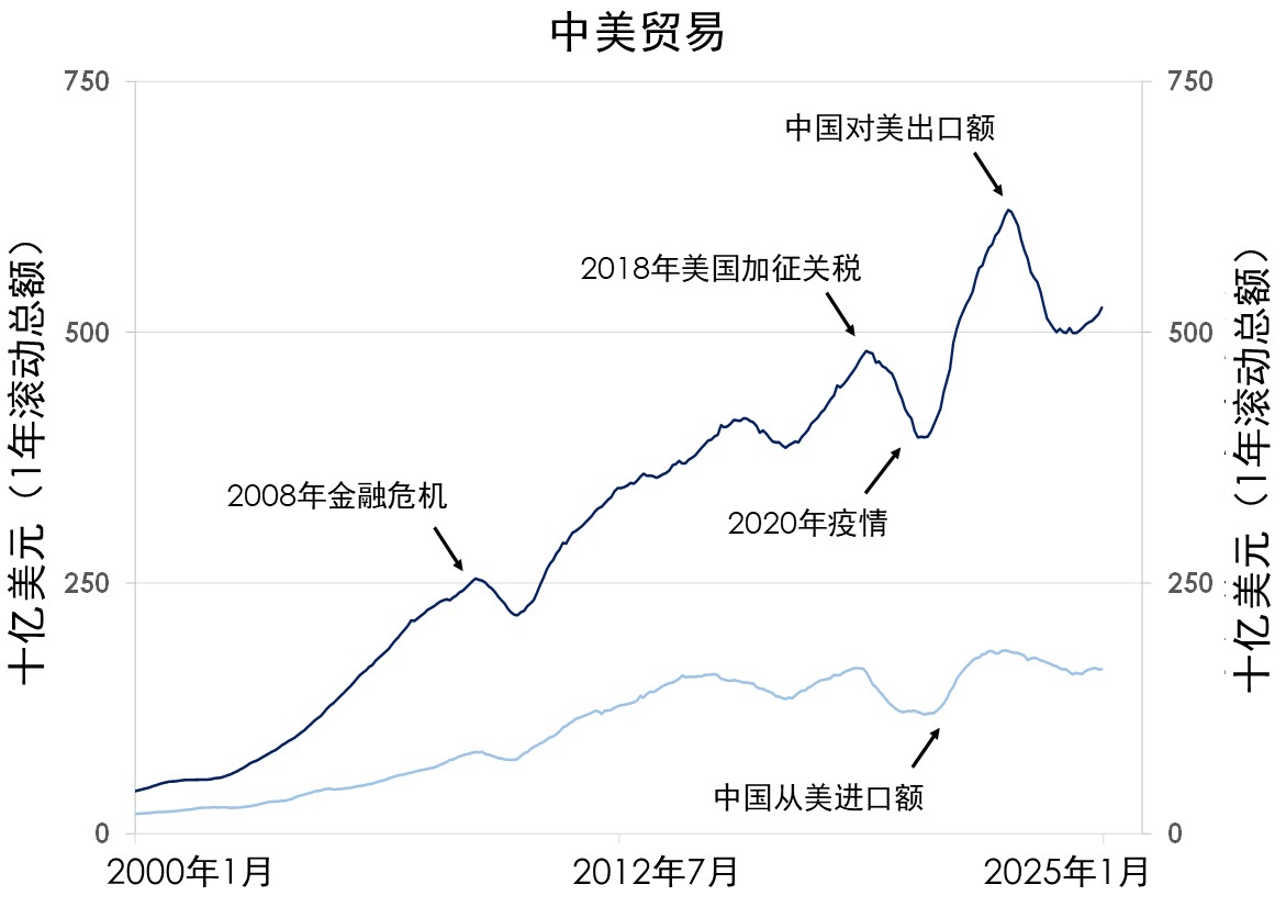本行对2025年的最新预测已充分考虑贸易摩擦加剧对经济增长的负面影响。本行预计,2025年美国GDP增速将从2024年2.8%的强劲水平放缓至相对稳健的2.2%,中国GDP增速则将从去年的5.0%回落至今年的4.2%。如第二张图表所示,2024年中国对美出口总额达5,250亿美元。若全年实施20%的额外关税税率,或将导致中国GDP增速下降高达1个百分点。