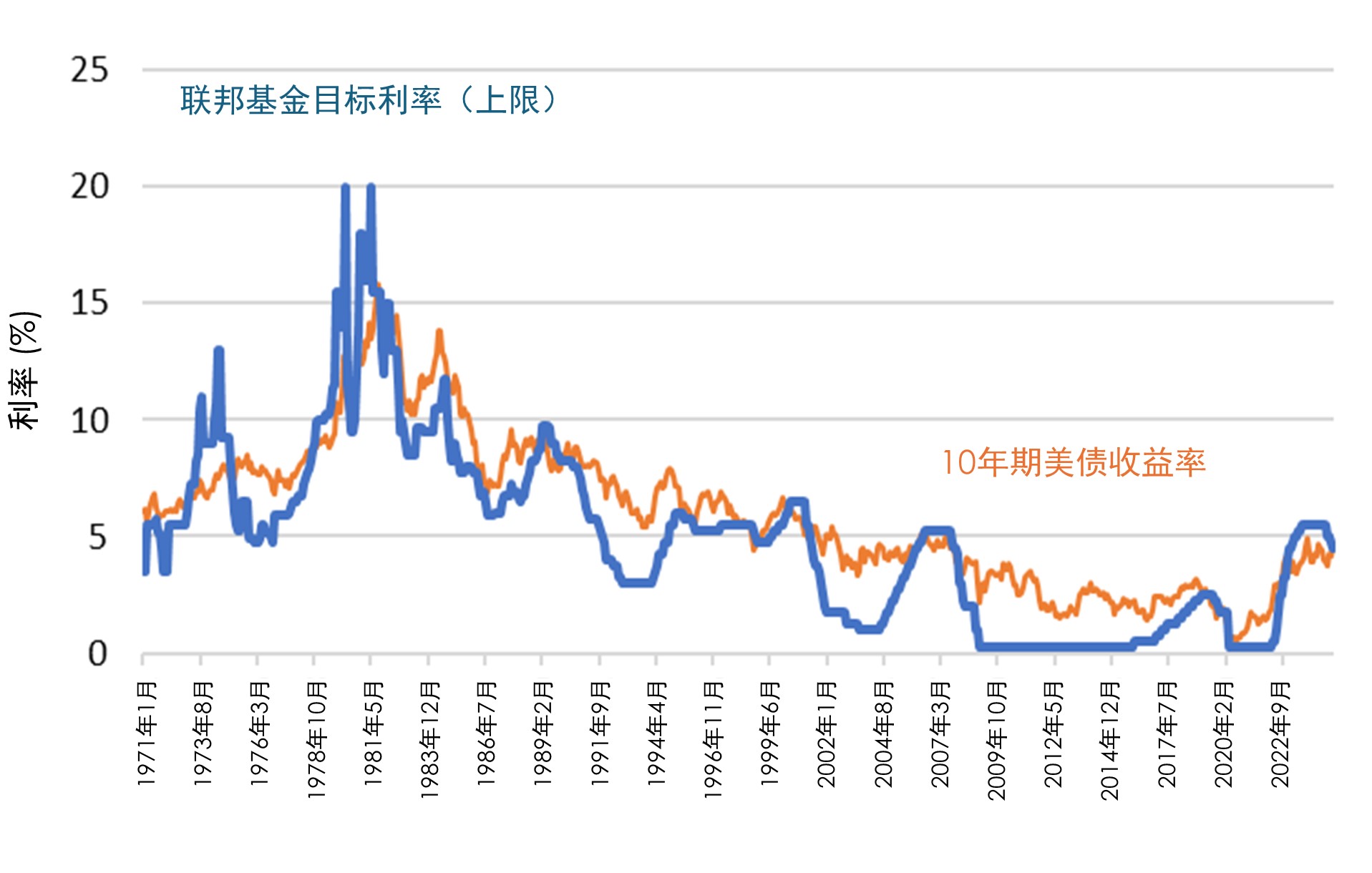 图表5:10年期美债收益率和联邦基金利率(1973-2024年月度数据)