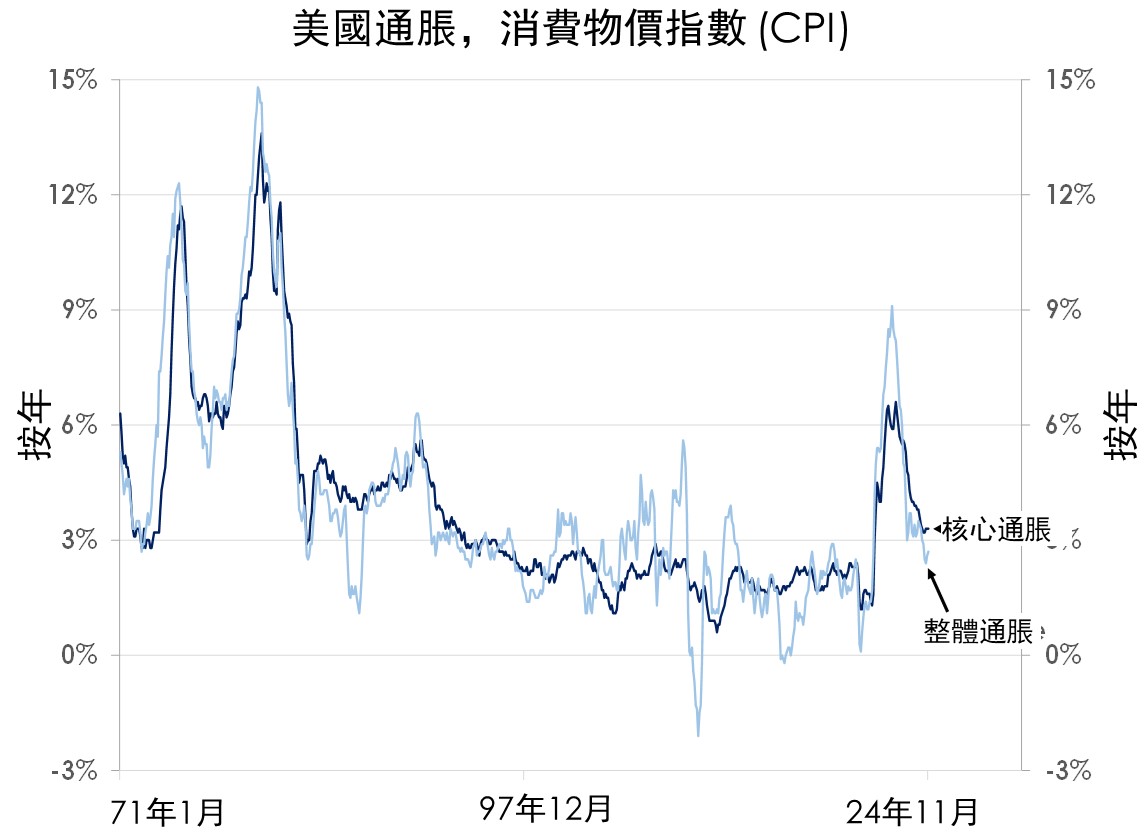11月份美國消費物價指數符合預期,整體和核心價格(剔除食品和能源)均上漲0.3%。如下圖所示,整體通脹目前為2.7%,遠低於2022年9.1%的峰值;核心通脹為3.3%,低於兩年前的6.5%。