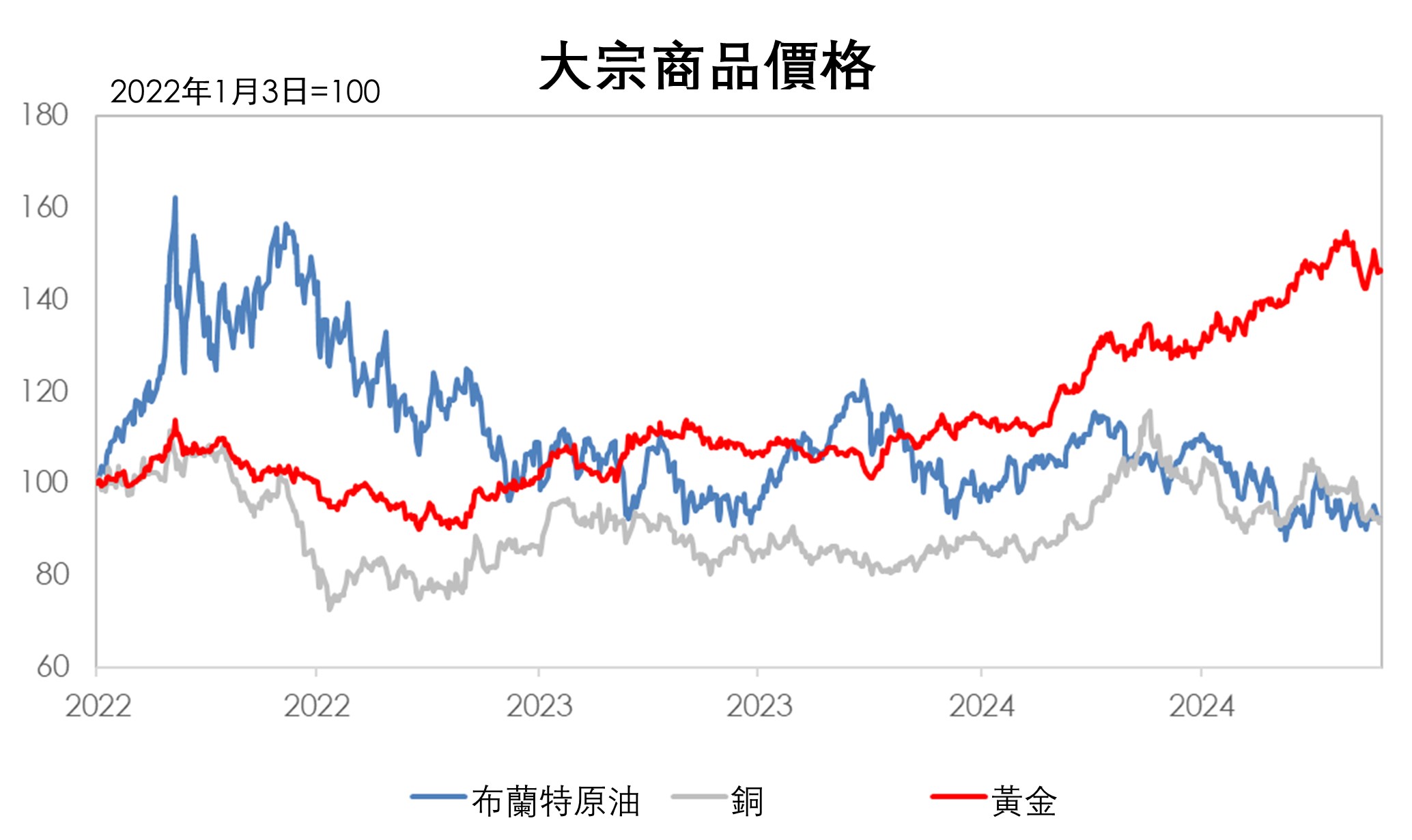 隨著特朗普當選、共和黨完勝,石油、黃金和銅等大宗商品風向標出現橫盤整理或下跌走勢。關稅相關增長風險問題令石油和銅等工業大宗商品承壓,而美元走強仍將在短期內打擊金價表現。本行預計2025年金價將進一步上漲,而石油和銅價格將維持區間波動。