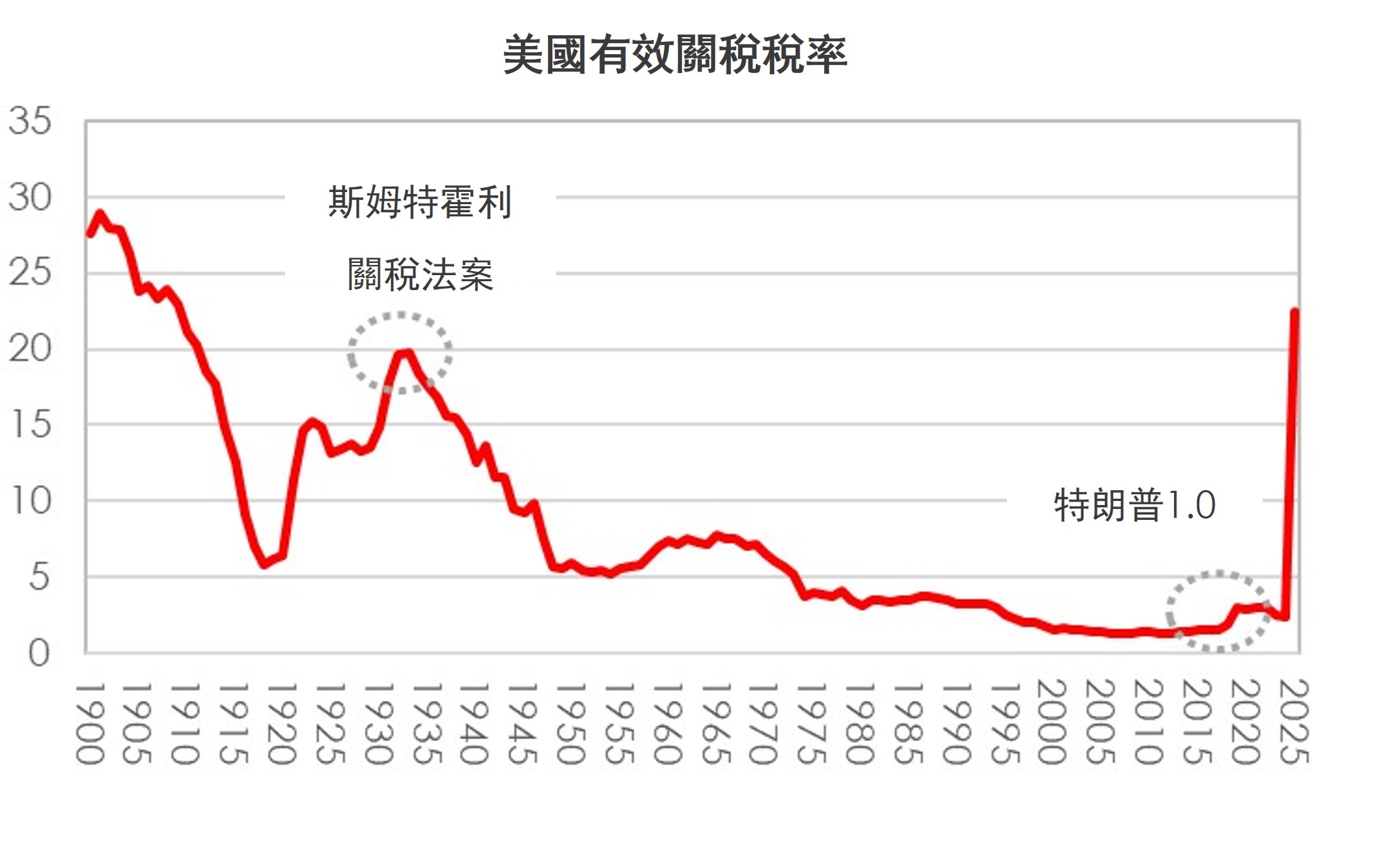 美國公佈的關稅計劃在影響範圍和規模上都超乎預期,導致全球增長預期下調,尤其是對美國而言。 在計入2025年迄今宣佈的所有關稅後,美國有效關稅稅率將在20-25%區間,較去年年底的2-3%大幅提升。 這是美國百年來的最高有效關稅稅率,超越上世紀30年代「斯姆特霍利關稅法案」時期的最高紀錄。