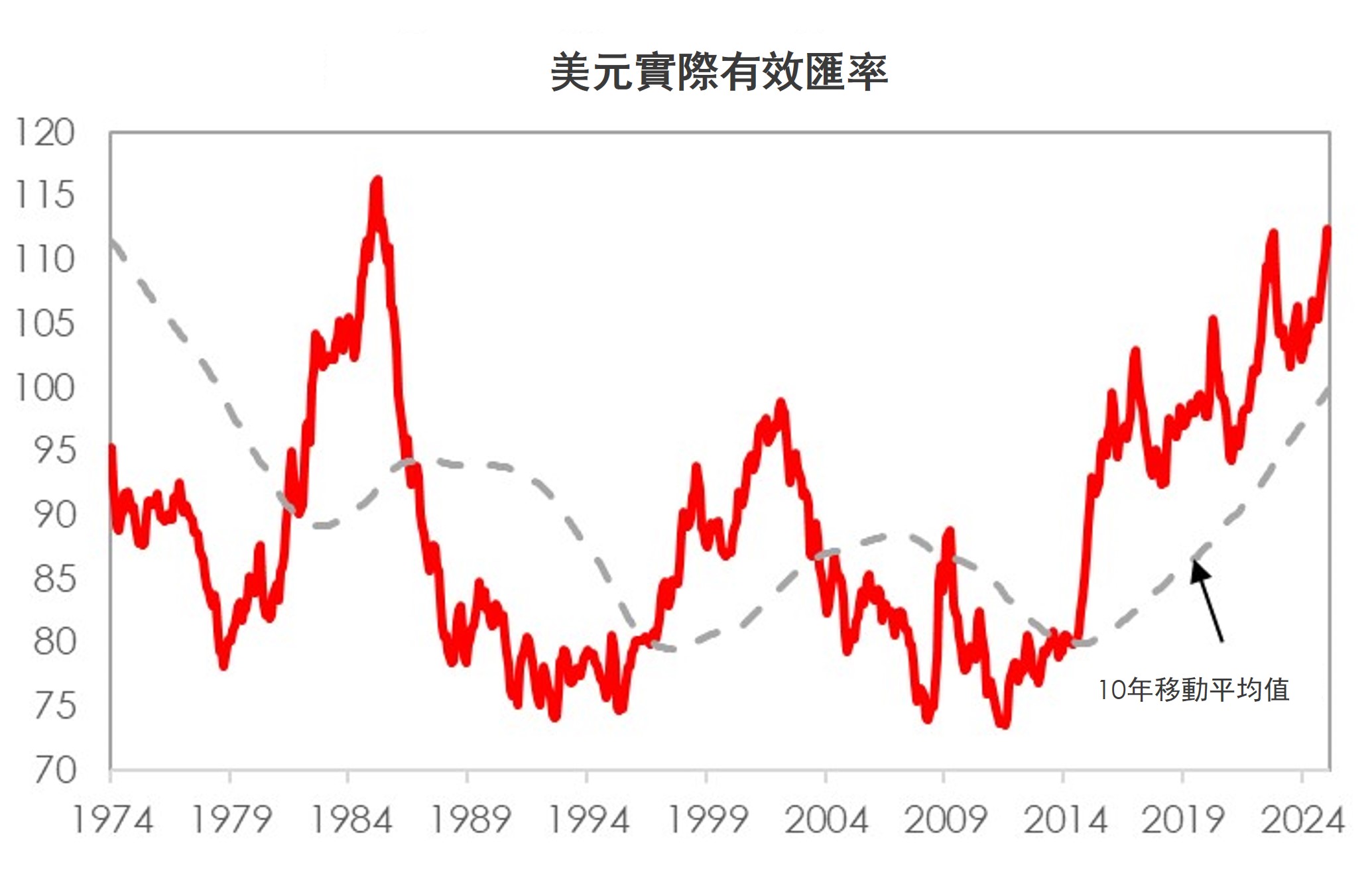 資和儲備貨幣地位,令市場質疑美元的全球地位是否依然穩固,因此本行觀點有所轉變,看空美元前景。 美元的實際價值在過去10年有所上升,從某個指標衡量甚至認定其匯率高於長期平均值12%。