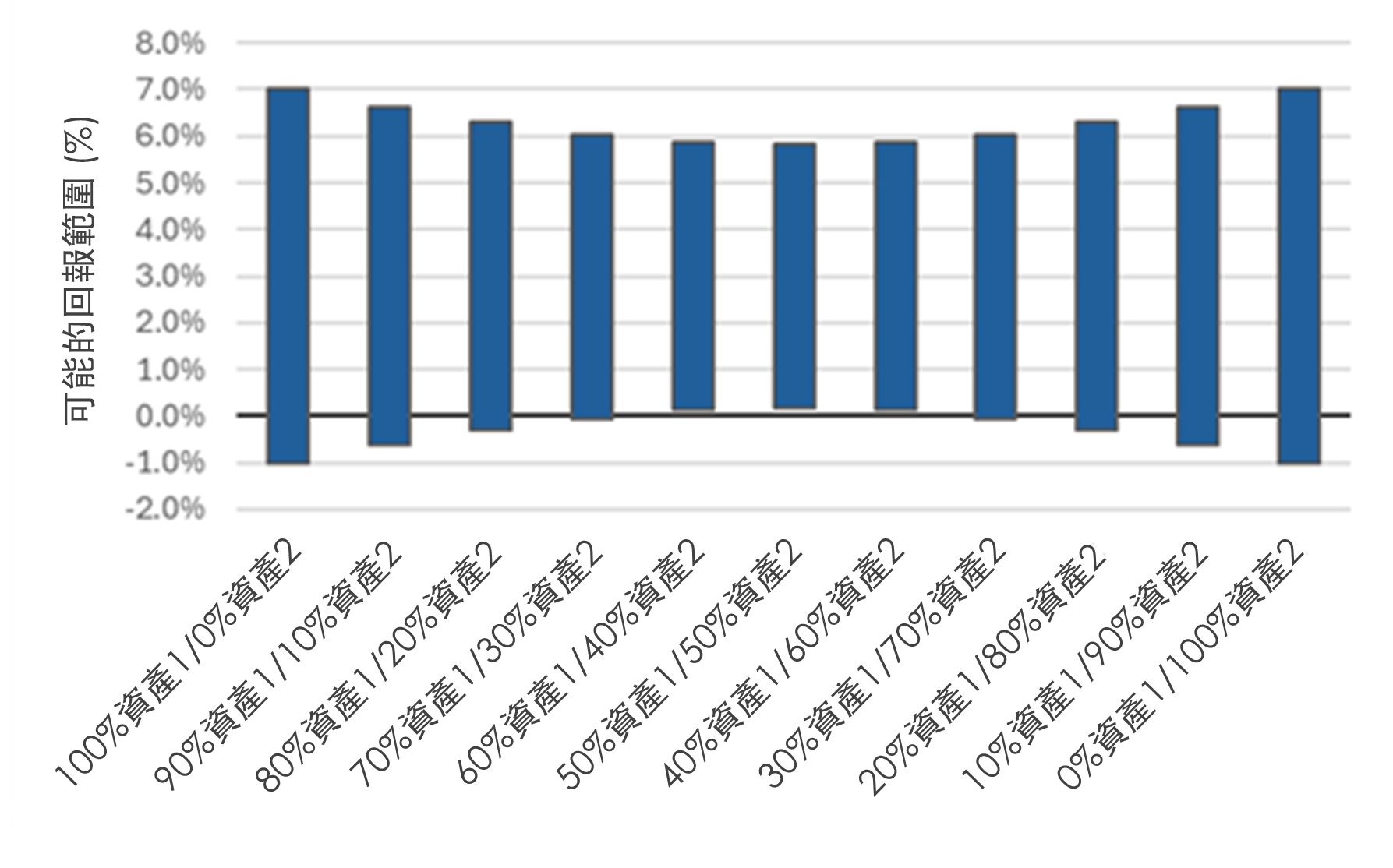 雖然不確定性永遠無法完全消除,但多元化的投資組合對於降低整體投資不確定性大有裨益。請看以下簡化示例。假設有兩項資產,預期每項資產的回報範圍為-1%至7%,平均回報率為3%。假設這些資產彼此獨立(即它們的回報相關性為0)。如果我們創建一個投資組合,平均投資這兩項資產,預期回報率將從-1%至7%,縮小為0.2%至5.8%(均值為3%不變)。這是原先可能產生的回報範圍的70%,對於希望在財務規劃中獲得更大確定性的投資者來說,這一回報範圍的縮小是很有價值的。下圖數據闡述了這一實驗性假設,展示出這兩項資產所佔權重的變化可能產生的相應回報範圍。