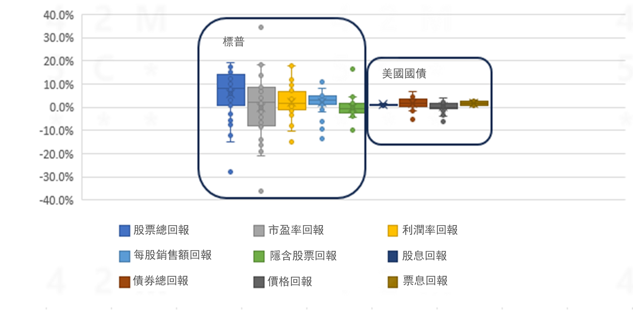 圖表3:標準普爾500指數、美國國債指數回報率及其各自組成部分的分布(1992年至2023年年度數據)