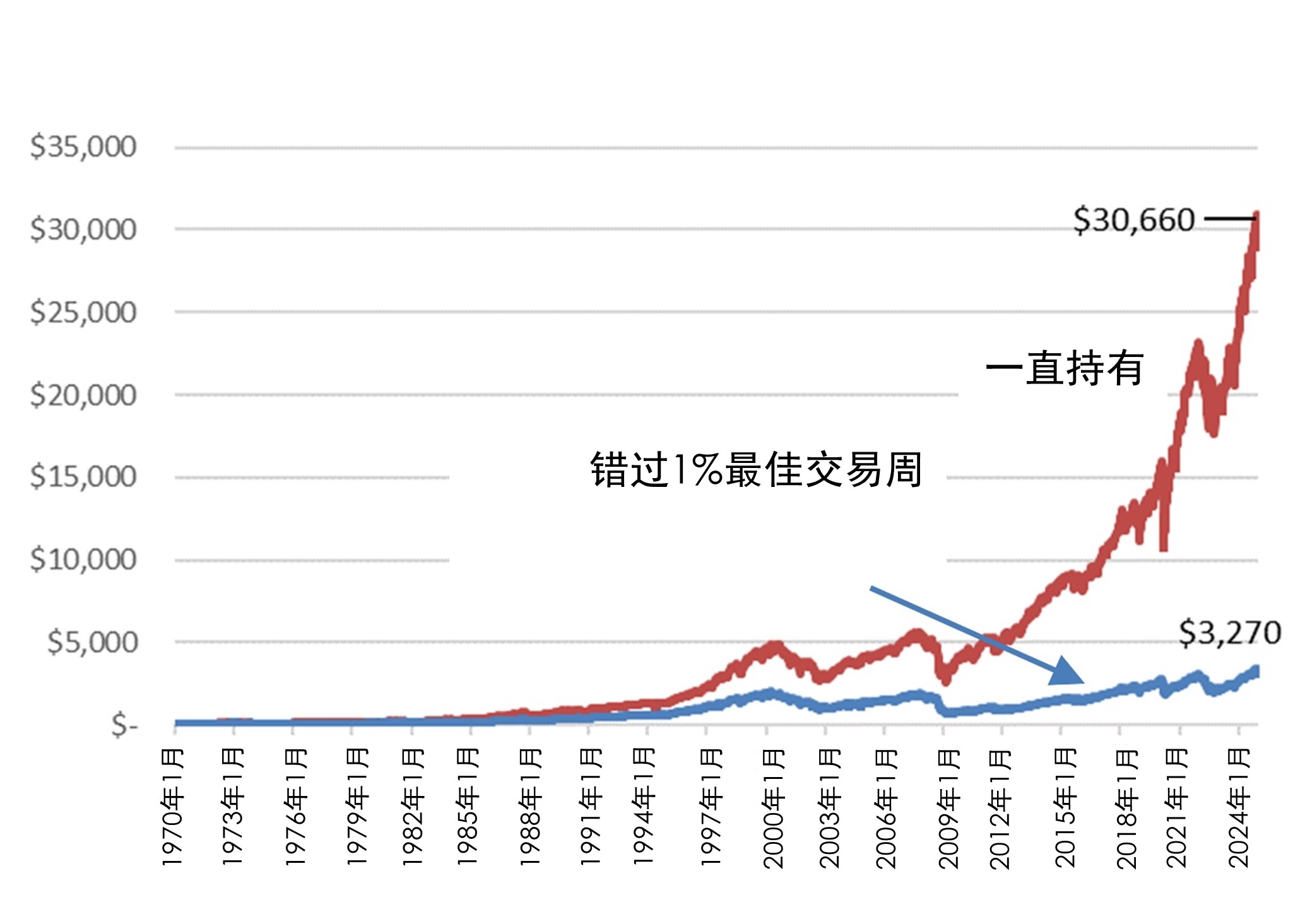 把握時機至關重要,而未把握好時機則可能需要付出巨大代價。統計結果表明,只要錯過幾次表現最好的行情,回報就會大幅減少。下圖顯示了100美元投資於標普500指數的兩種情況:第一種是從1970年開始投資並一直持有到2024年,第二種是同一時期但錯過行情最佳1%交易週的情形。兩者的最終回報價值相去懸殊。