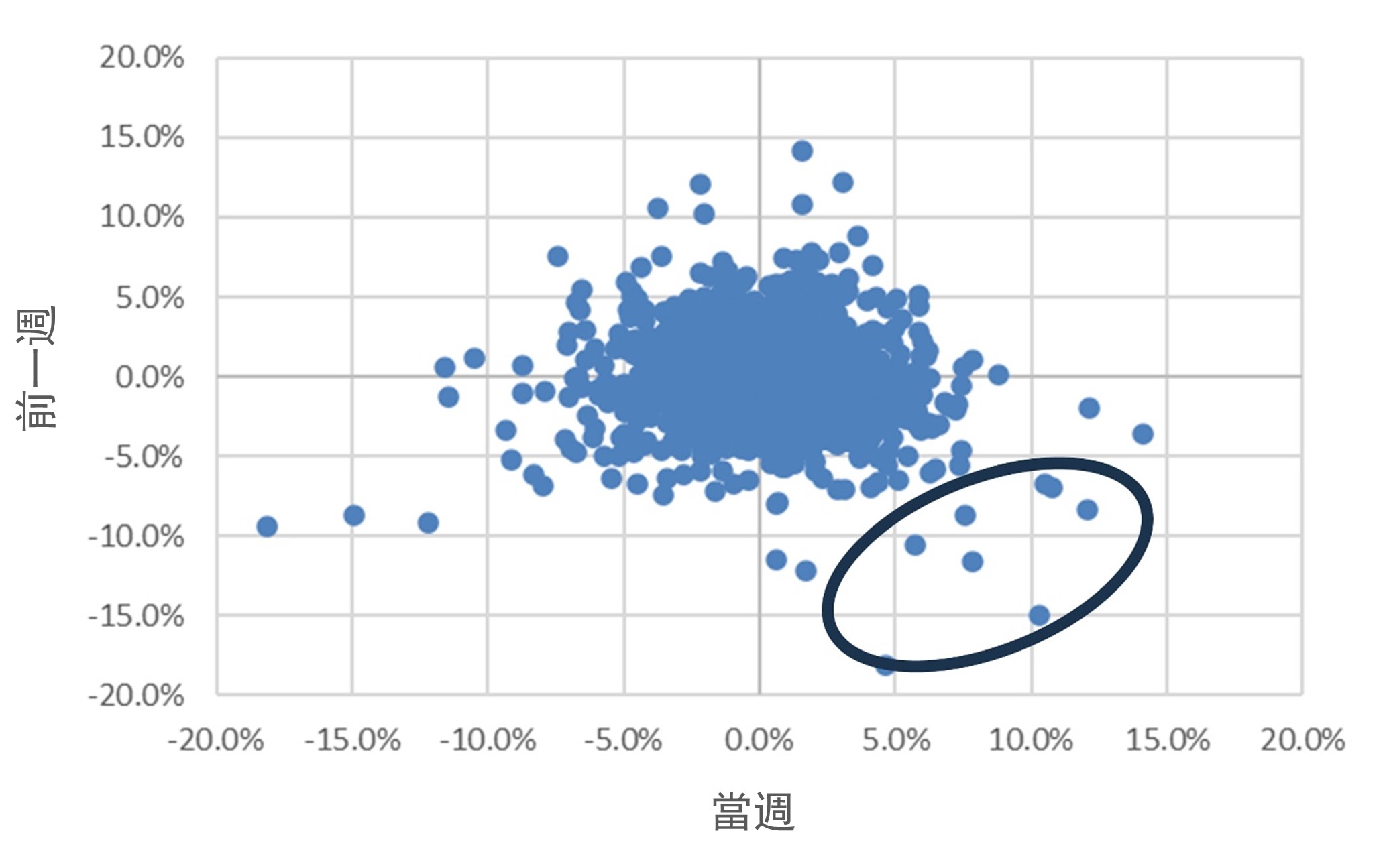 圖表3:標普500指數當週總回報率與前一週回報率(1970-2024年)
