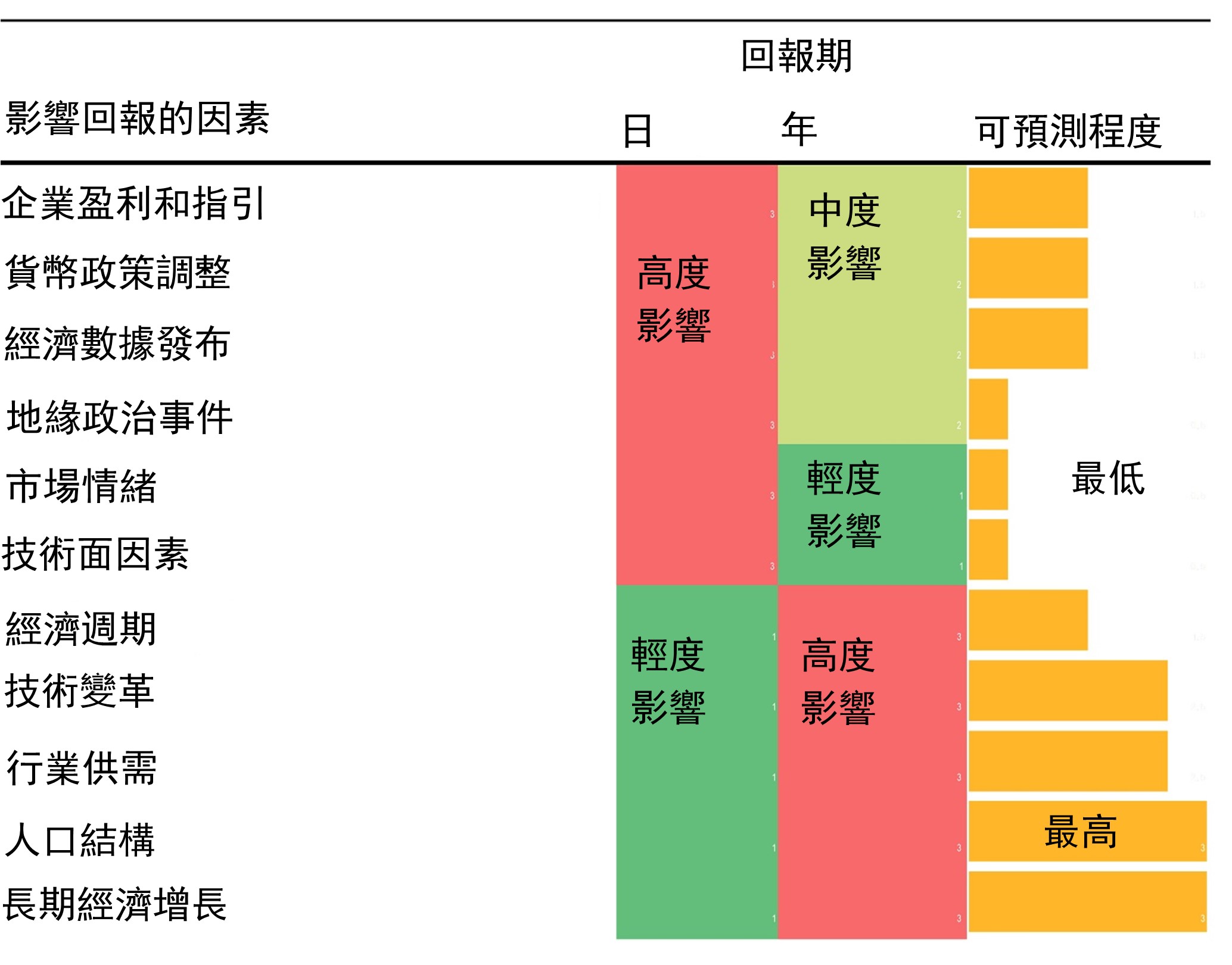 注重日回報的投資者會發現市場行情有54%的時段上漲,有46%的時段下跌。此等回報波動顯著,可能令投資者倍感壓力,貿然做出決策,如出現恐慌性拋售和過度交易行為。此外,諸多因素都對短期回報走勢有著重大影響,如地緣政治事件、市場情緒波動和技術層面因素等(見圖表5上半部分,其中列出了高度影響每日表現的因素),然而,這些因素都難以預料,甚至往往無法預見。過度自信偏見會促使投資者相信自己能一直預判市場走勢,而事實上,許多短期因素都不在可預測範圍之內。