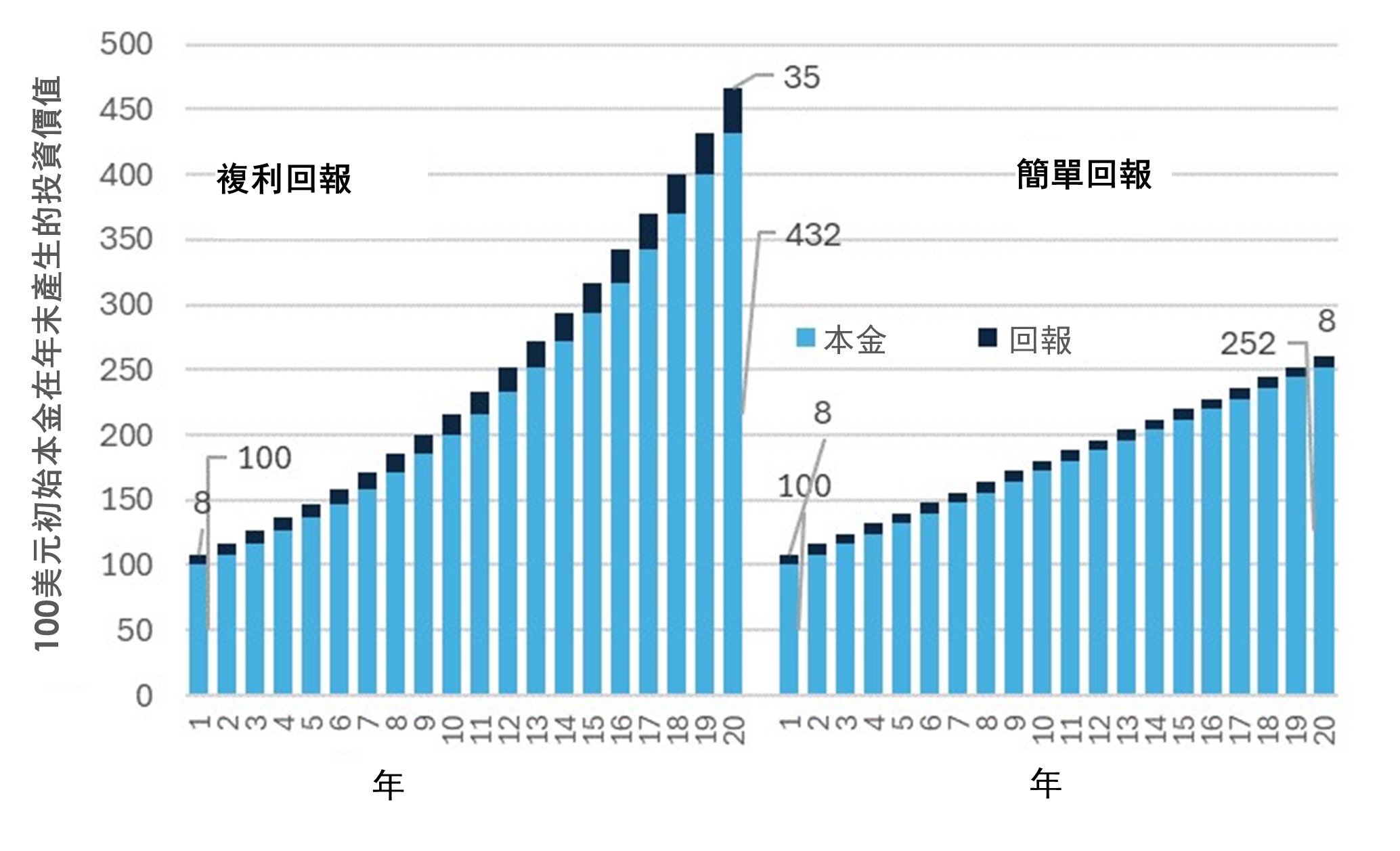 為了比較複利與簡單回報的顯著差異,下圖展示簡化示例,假設100美元的投資在20年內每年均能穩定獲得8%的回報。在複利情況下,回報會用於再投資,以增加本金,新的本金總額會繼續獲得8%的年回報:第一年賺取的8美元添到最初的100美元本金上;第二年108美元的本金總額又可獲得8%的回報,即8.64美元;第三年116.64美元的本金總額再獲得8%的回報,即9.33美元;以此類推。而在不將回報再投資的情況下,投資者每年均只靠初始本金獲得8%的回報(固定為8美元),因此投資額每年以8美元的幅度線性增長。隨著時間推移,複利與簡單回報之間的差額越來越大:第一年兩者之差為零,而到第20年,這一差額擴大至206美元,佔簡單回報策略投資組合總額的80%。因此,投資者在市場中持有投資的時間越長,複利帶來的優勢就越顯著。